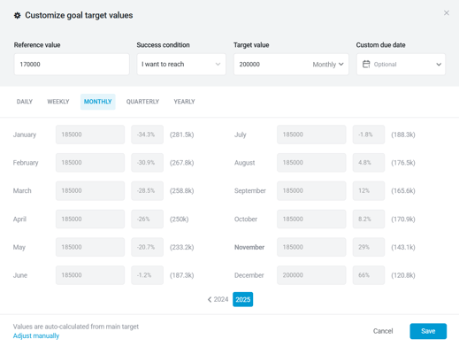 By default, target values apply to the current and future periods. To edit or include values for past periods: