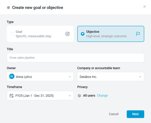 - Choose an owner (yourself or another user) and specify who the objective belongs to — either the company or an accountable team.