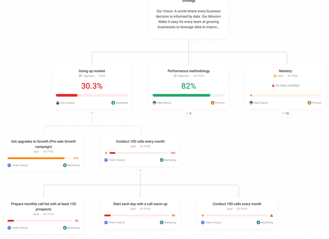 To view relationships between objectives and goals, switch to the Strategy map view using the control to the right of the Status filter. The map view visualizes how goals align under each objective or goal, giving you a clear, high-level picture of company progress and strategic alignment.