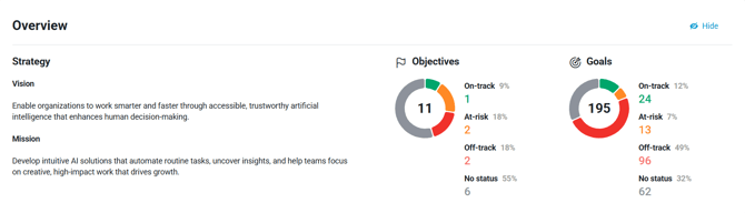 - Two pie charts show the current status of all objectives and goals, grouped by On-track, At-risk, Off-track, and No status.