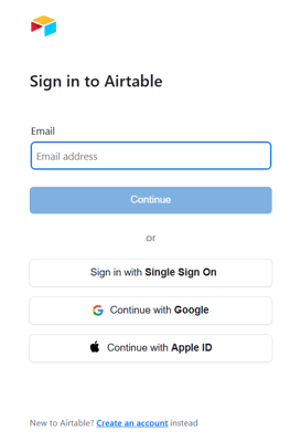 To connect Airtable to your Databox account for the first time, or when using new credentials, log in using your email address, Google account, Apple ID, or SSO provider.
