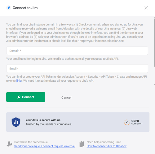 1. In Databox, enter your Jira Domain. Your domain should look like https://your-instance.atlassian.net/
