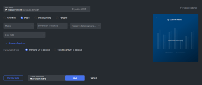 The Pipedrive CRM integration allows you to create custom metrics using the metric builder, ideal for visualizing data not included in the basic metrics offered by the integration.