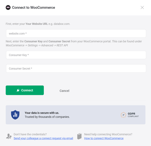 Databox uses WooCommerce REST API credentials to securely authenticate your store connection.
