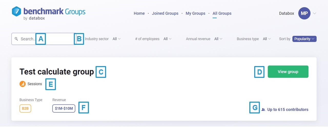 - Joined Groups: Consists of all of the groups you have joined. As a group member, you are able to view the benchmarks of the groups you have joined if you meet the specified group criteria and if you have data available for the specific benchmark.