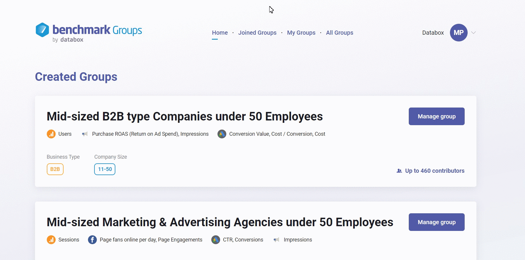 Databox's Benchmark Groups product allows you to benchmark your company's performance against groups of similar companies and helps you set better strategies, business goals, and improve overall performance. A Benchmark Group is defined by cohort characteristics, such as company size, yearly revenue, type of business or industry, and the selected set of metrics from different sources.