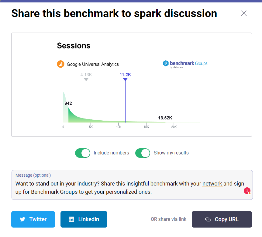 - Click on the Twitter or LinkedIn buttons to share the Benchmark Group on Twitter or LinkedIn. You can also share the Benchmark Group via a link. Click on the blue Copy URL button, you can paste this URL in an email, slack etc. to share this group with anyone who would like to join this specific Benchmark Group.