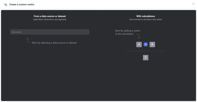 Use this option to create a custom metric by selecting a data source or dataset and configuring it in the metric builder using dimensions, filters, and aggregation options.