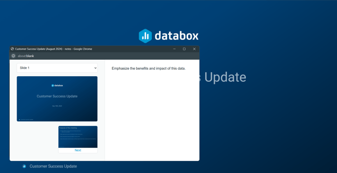 As an alternative to sharing the report in PDF format, Databox allows you to display reports in presentation mode. This feature presents your reports in a clean, full-screen view, with the option to show any saved speaker notes in a separate window. It's an excellent choice for live presentations, offering a more interactive and engaging way to present your content.